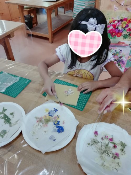 夏休みの宿題の自由工作のための押し花ストラップ作りの最中も
